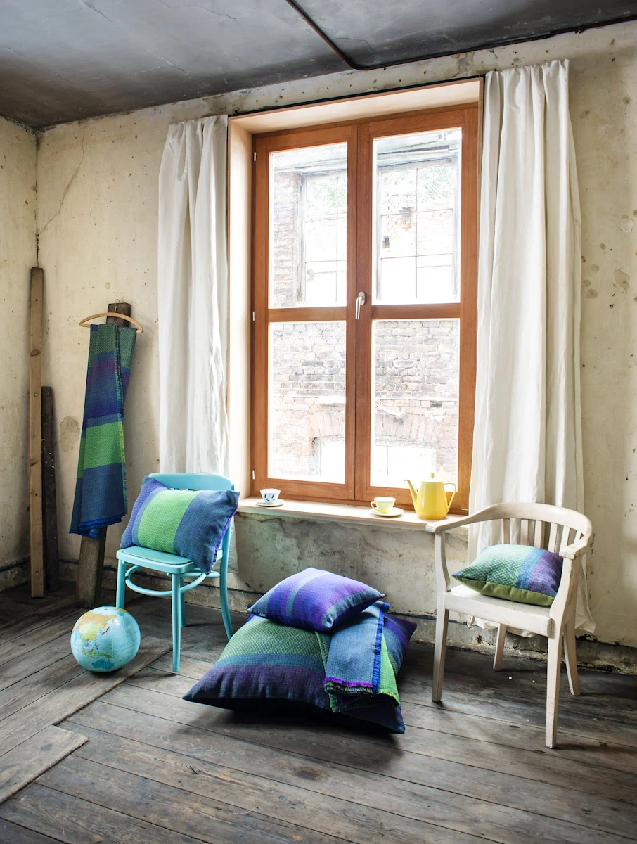 Une structure en grains de riz vient donner du corps à un jeu de larges rayures irrégulières, dans une harmonie de couleurs évoquant la végétation après la pluie.